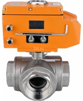 Кран шаровой DN.ru BV3232P(4pc)-SP-3WT-T-ISO-H Ду40 Ру63 стандартнопроходной T-тип, трехходовой, нержавеющая сталь, внутренняя резьба, уплотнение - PTFE, с эл. приводом DN.ru E34-N-005EM-O1-220VAC-У1 с сертификатами качества. Доставка. Гарантия. В наличии! Звоните!