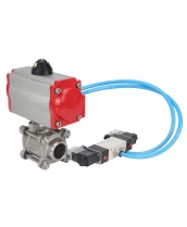 Кран шаровой DN.ru BV3232P(3pc)-FP-W-ISO-H Ду65 Ру25, полнопроходной под приварку, нержавеющая сталь SS316, уплотнение - PTFE, с пневмоприводом PA-DA-083 двойного действия, с пневмораспределителем 4V320-08 220В