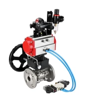 Кран шаровой DN.ru BV3232P(3pc)-FP-F-ISO-H Ду50 Ру40, трехсоставной полнопроходной фланцевый, нержавеющая сталь SS304, PTFE, с пневмоприводом PA-DA-083, с пневмораспределителем 4V320-08 220В, БКВ APL-210N, ручным дублером MON2-450-T28-ISO, БПВ AFC2000 Краснодар